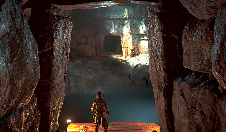 Head to the right of the chamber and you’ll see a tunnel with steps leading upwards. Follow this tunnel and you’ll approach a window-like hole in the stone ahead. Beyond this lies a much larger chamber with water separating the two ends.