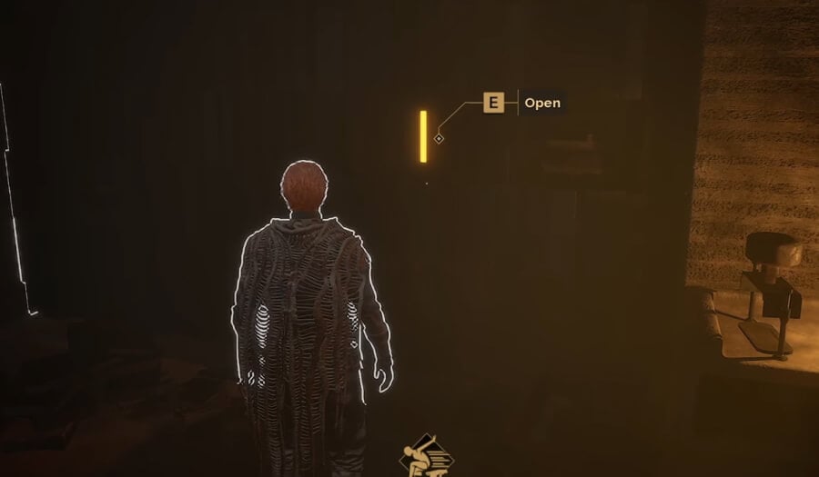 Follow the entrance to the next room once you are at the bottom of the staircase and you will find yourself in a long corridor with the green energy door at the end. Towards the end of the corridor, but before you go through it, you'll see a bookshelf with a yellow light on it as shown above. Open the door and head inside.